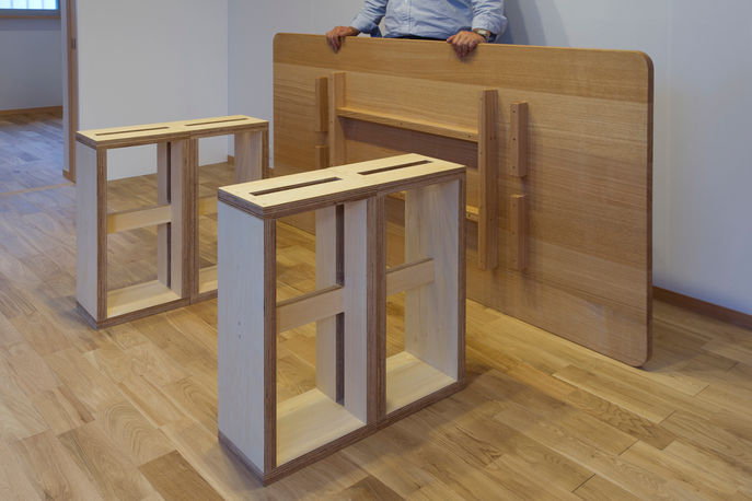 箱脚を組み合わせて食卓と座卓に両用できるテーブルや金具で4本脚を着脱できる打合せテーブルなど、ご要望に合わせて製作します。